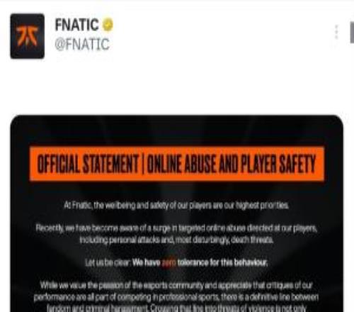 FNC俱乐部发布声明保障选手安全:对网络暴力与死亡威胁零容忍