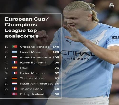- 最快达成欧冠50球所用场次排名!梅西66场哈兰德比梅西少用17场