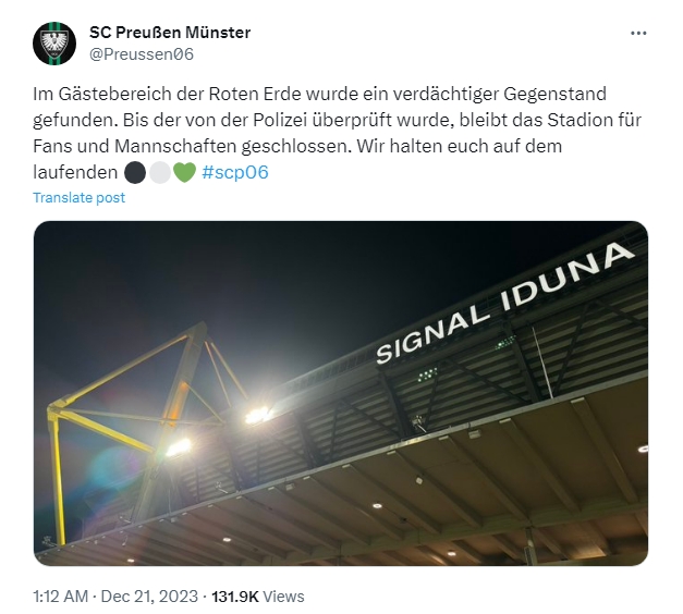 官方消息传来,原定于北京时间12月21日凌晨2点进行的普鲁士明斯特与多特蒙德2队之间的德丙比赛被迫推迟。原因在于警方在罗特艾德球场附近发现了一物疑似雷管的物体。明斯特官方社媒发布声明称:“...